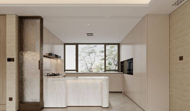 建面约139m²精奢上叠,南向面宽同样达到了约9.2m、三开间朝南,首层全明设计,南北通透,面面瞰景,大尺度U型厨房,约2.2m的大岛台,搭配LDKB一体化动线,盛载亲情时光,温馨南向卧室搭配全景飘窗,满足家中长辈静心安居所需;