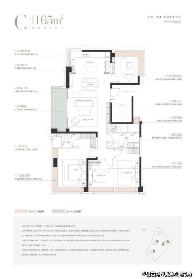 大横厅尺度感奢阔,尊享私梯入户,隐私性满分!三间卧室朝南设计的平权户型,老人、小孩均可享受南向采光;厨房转角窗、主卧套房、北向书房均配置270度转角飘窗,景观视野相当不错!次卫四分离设计,相当人性化~