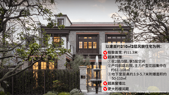 户型设计:210㎡风貌别墅为2层建筑,近11米南向面宽,LDK一体化通厅连接40㎡南向庭院,主卧带270°转角飘窗与步入式衣帽间,底层配备5.2米挑高地下室。280㎡花园别墅为地上三层+地下一层规制,南向庭院面积达80㎡,顶层露台配备星空观景台,融合老上海老虎窗、铁艺栏杆等风貌元素。