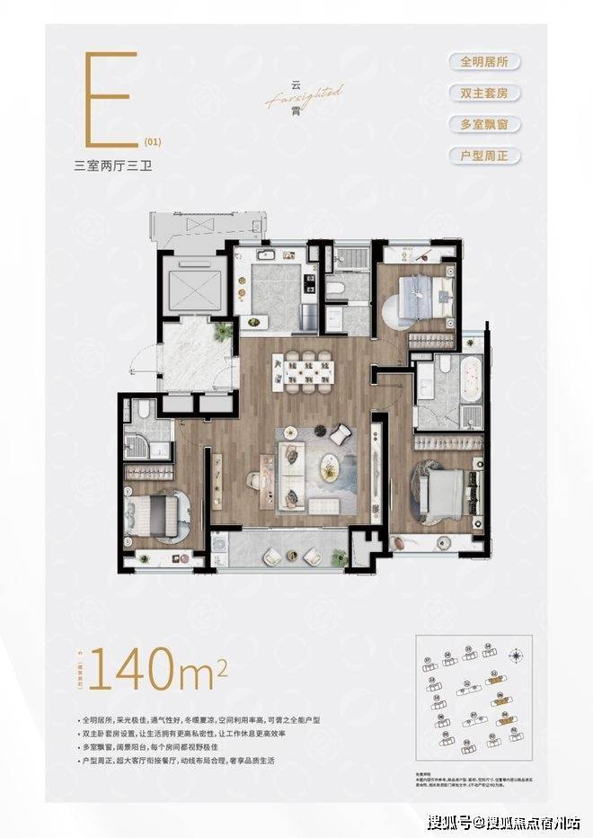 建面约140㎡3房3卫户型,✅✅陆家嘴锦绣云澜售楼处电话:400-8855-420✨✨三开间朝南+大横厅的设计,整个南向采光面相当宽绰。
