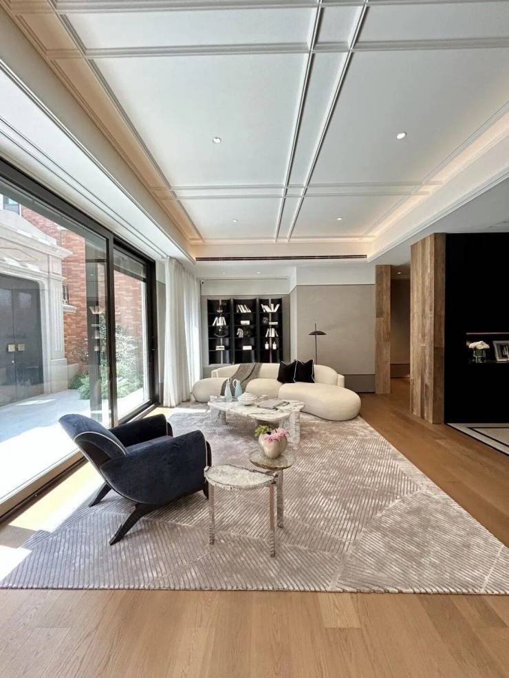 「无界空间」:客厅270度转角无柱设计,搭配落地玻璃,开阔视野将院中风景迎入日常。