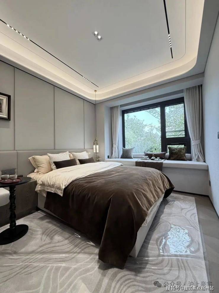 主卧转角落地窗+飘窗,也算是非常少见的了。净面宽约3.6m,不算进门的衣柜,进深大约5.7m左右。根据测算,可以放置宽约2m的床+2个床头柜(宽度约45cm/个)是可以的。