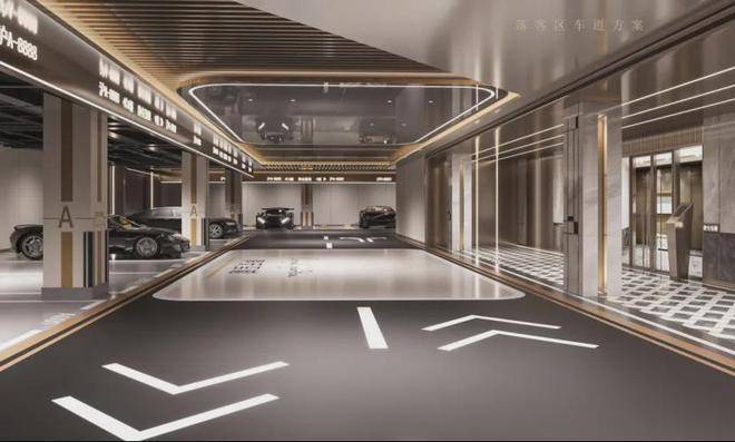 项目车库采用贯穿式鱼尾灯坡道和超耐磨地坪,过道全部采用精装吊顶,地下管道和局部区域进行二次包裹!尤其惊艳的是项目的豪华车马厅, 采用水磨石、水晶漆、铝饰面、大板砖、立柱石材包边、门禁系统三合一!