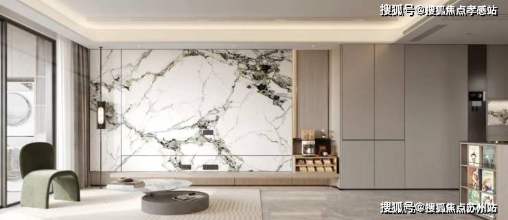 当你归家步入地上大堂,映入眼帘的便是精致细腻的岩板背景墙,其独特的自然纹理和色彩仿佛将大自然的美景引入室内,带来一种静谧而奢华的氛围。