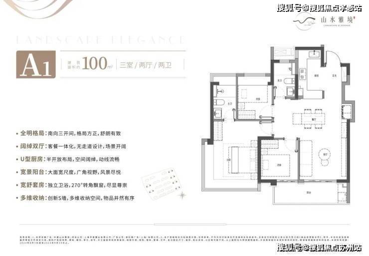 建面约100㎡3房户型采用南向三开间布局,大面宽尺度实现全明采光,营造出明亮通透的居家氛围;