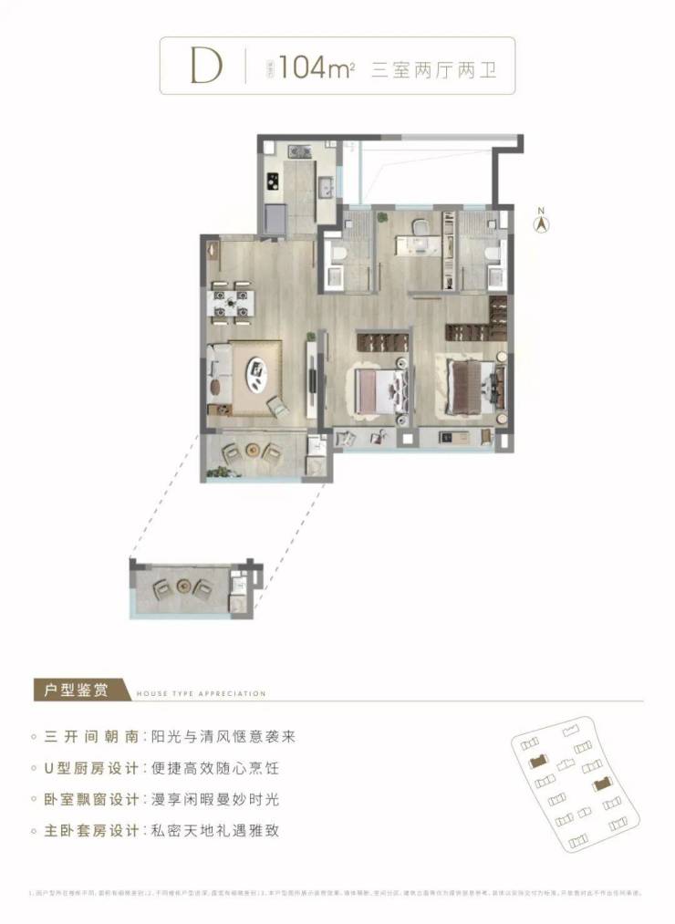 3)建面约104㎡3房2厅2卫,中间套D户型
