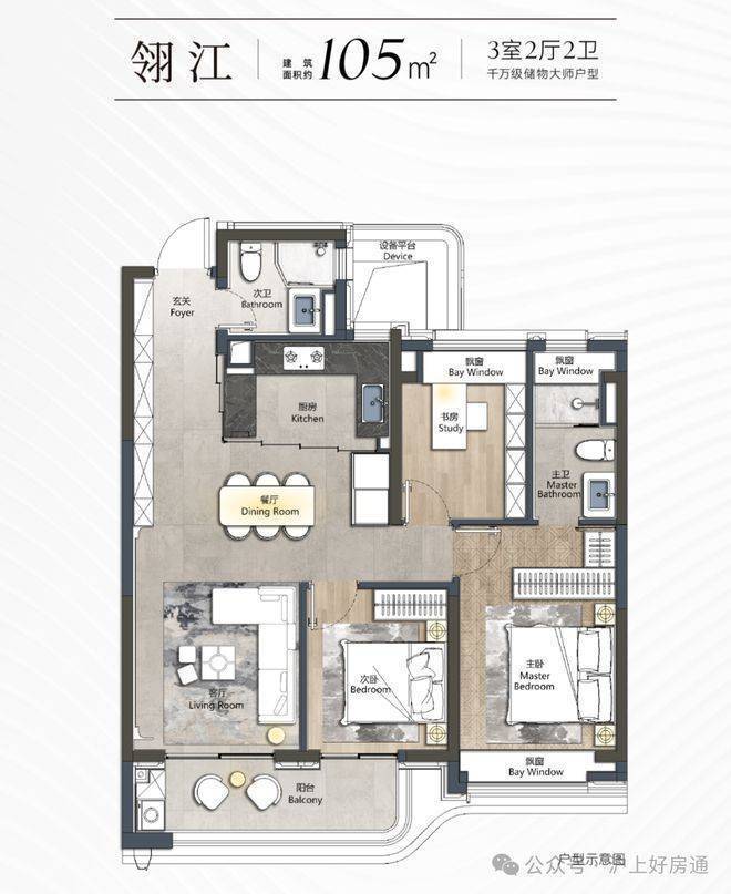 另外,一个优秀户型应该有的设计,包括入户玄关、3间卧室带飘窗、约270度采光面阳台、卫浴干湿分离...这个户型全部具备。