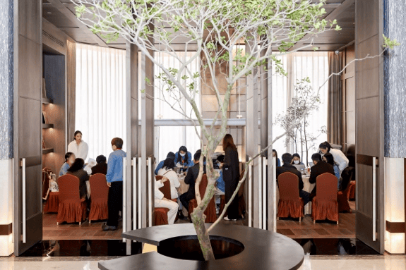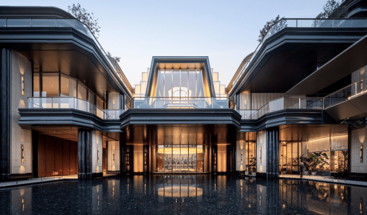 建筑立面融合的东方圆融温润的美学,将原生石材与金属铝板完美融合,呈现出显赫于外的豪宅场域。同时借鉴瑞士钟表业“马耳他十字”的工艺灵感,实现不同质地用材的融合。于此同时,安澜上海在内部打造上海首个多层次垂直山林漫游系统,通过三层立体花园与五大浮空院落的交叠,在城市中心营造出一座“五感沉浸的万籁之境”。