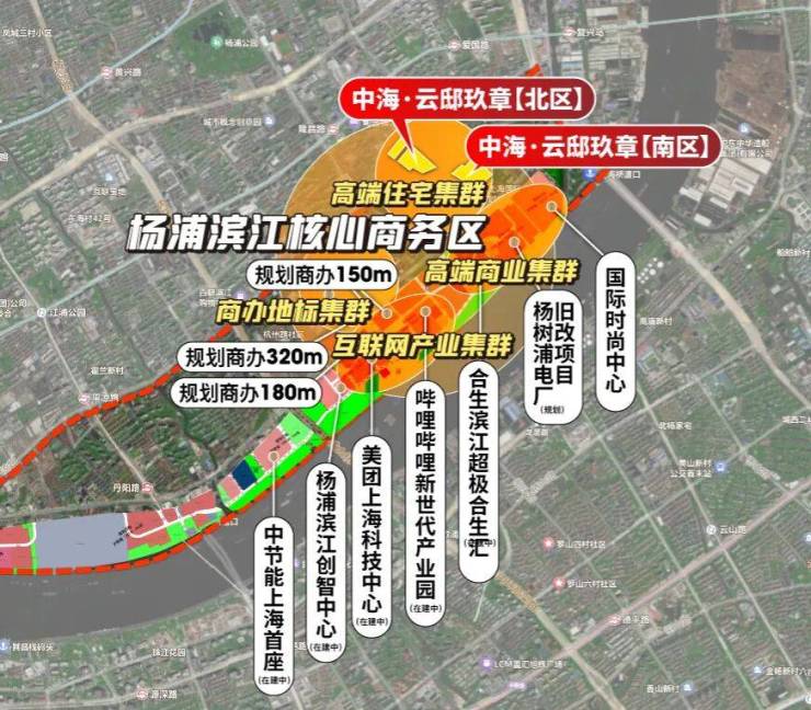 中海·云邸玖章距离江岸直线距离仅约500m,作为当下片区内离江最近的项目,享美团、B站、超级合生汇等地标综合体配套,杨浦滨江生活中心。