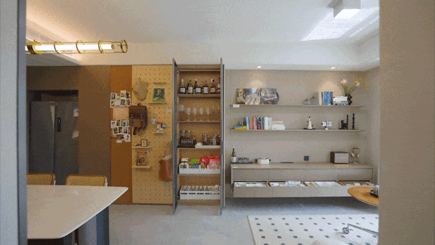 大家注意客厅左边的三面墙,软木墙可以贴上回忆照片或者每日备忘录。洞洞板的护杆可以根据高低不同随意调节,自由组合一个展示空间。酒柜则可以摆放微醺的饮料或者高雅的红酒,随时品尝。