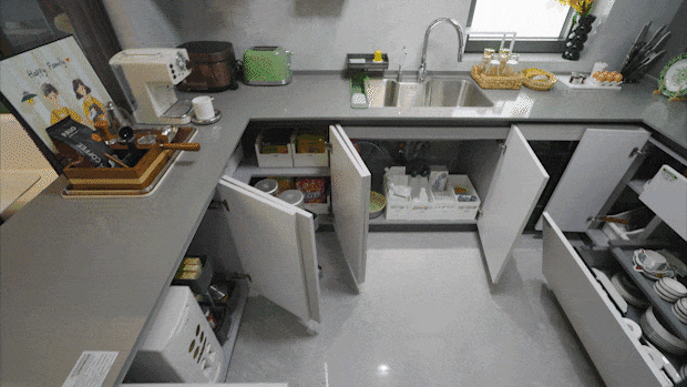 地柜收纳:可放清洁用具,锅具、米面等比较重的囤货