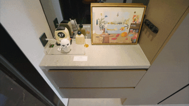 进门之后左手边就是玄关柜,除了台面上可以摆放悦己的摆件、钥匙以及手机充电装置。