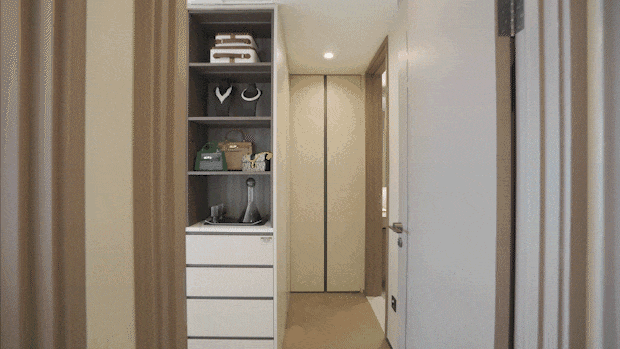 主卧飘窗的设计堪称惊艳!项目在飘窗侧面做了一个抽拉薄柜,平时不影响采光,需要的时候拉出来可以设计成一整面的珠宝墙。还同步配置了抽拉书桌,可以成为女主人的化妆台,也可以成为临时办公用地。