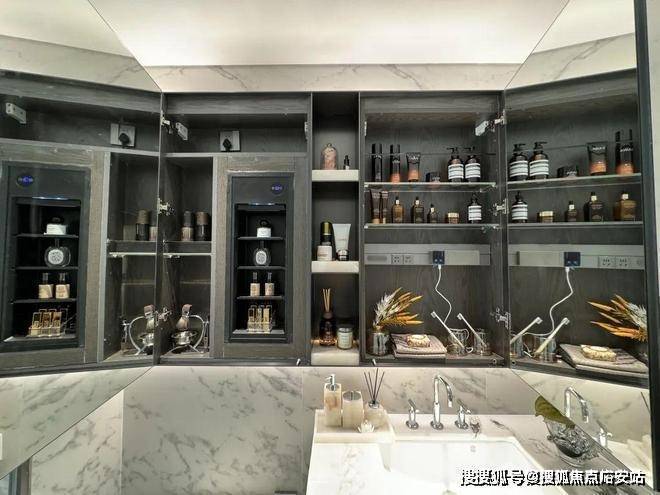 双卫配置,其中一个做了干湿分离,科勒台盆+双智能马桶+高仪花洒,除雾镜柜均内置了牙刷消毒器、预留吹风机插座。主卫镜柜还有美妆冰箱,收纳空间相当充足。