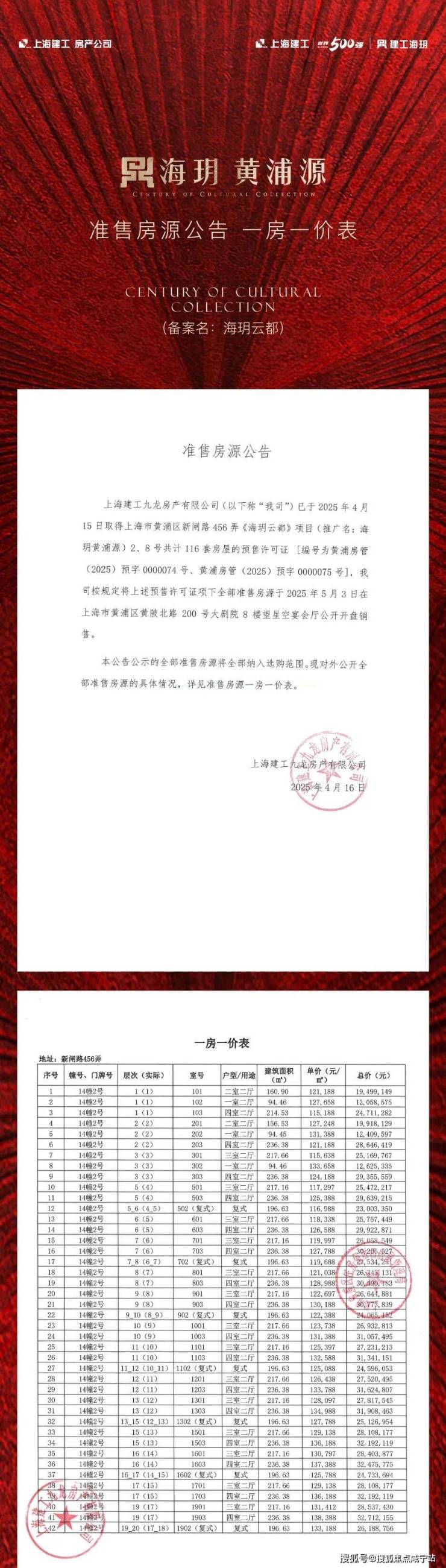 黄浦区「海玥黄浦源」少量建面约196-402㎡多种户型;均价14.56万/㎡!