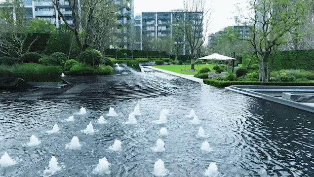 并通过跌水、涌泉和镜面水景等水景组合,将内部水景与外部水岸紧密相连。