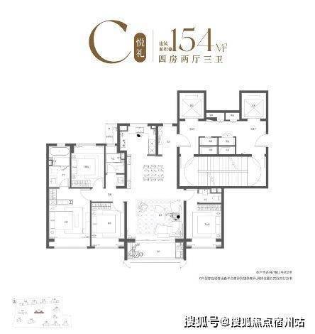 约154㎡4房2厅3卫设计,整体格局方正,南北通透,四开间超14米奢阔尺度 ,阳光清风肆意流淌。 约9.9米阔绰LDKB一体化空间,大尺度的竖厅 设计,容纳多元家庭欢欣团聚。