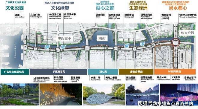 一个复合城区:功能集聚办公、商业、住宅、养老等类型,河道两岸布置教育、医疗、体育等公共设施;