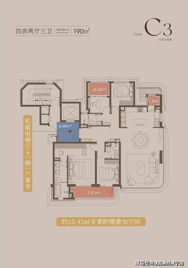 同时,这个户型拥有一个好户型应该有的所有特质:一梯一户、三阳台、主卧豪华套房、中西双厨...妥妥的终极改善产品。