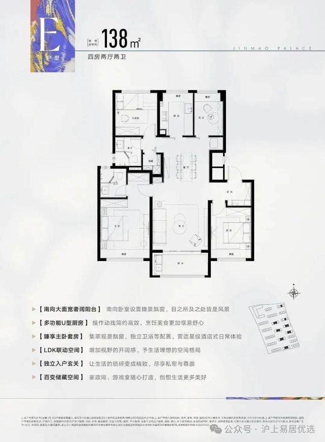 此户型为飞机户型,可以说是改善人群非常喜欢的户型,建面约138㎡4房2厅2卫设计,动静分区,三开间朝南,各空间尺度奢阔,还有一个大面宽景观阳台,实现功能性和舒适度兼得。