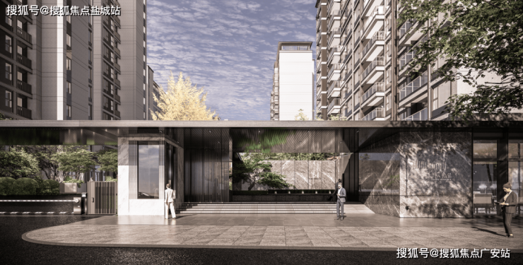 社区大门完全区分人行、车行入口,人行入口采用石材与玻璃搭配设计,大气恢弘!门厅景观水院精致高级,入户仪式感满满!