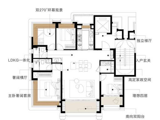 亮点:客厅面宽约 4.8 米、双 270° 转角飘窗、双阳台、独立电梯厅、超大储藏室、主卧双台盆卫浴、双排衣帽柜。