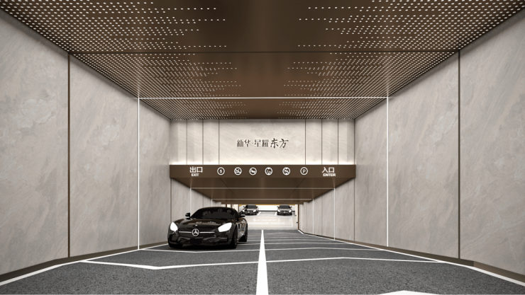 入口对行人、机动车进行优化分流,保障业主安全;而地面停车位,方便参观者、业主等临时停车的需求。另外在车库上,项目还打破了常规地库的单调、晦暗。直接将豪车专属的星空顶搬入了地库里。从车行驶入地库的那一刻开始,一场名为“宏大”的归家之旅就开始了。通道入口,顶部优雅的星空放射灯,展现出浩瀚星空般的深邃、璀璨,搭配两侧的高级铺面材质,尽显奢华气质。