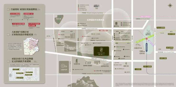 项目一街之隔即达好家福广场、虹桥食尚天地、京华路商业街等,与希尔顿品牌酒店集群形成黄金生活圈,下楼即享24小时醇熟繁华。约3公里辐射文旅古镇蟠龙天地、万科天空广场、夏都小镇、西虹桥商务区。约7公里触达七宝商圈、奥莱商圈及虹桥枢纽经济中心。