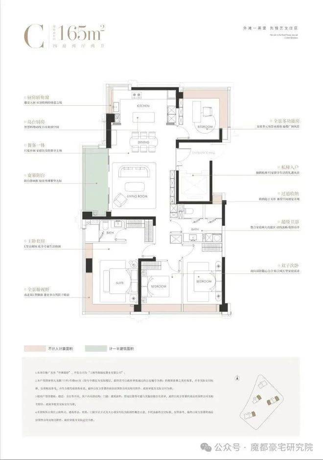 大横厅改善尺度户型,尊享私梯入户,隐私性满分!三间卧室朝南设计,老人、小孩均可享受南向采光;厨房转角窗、主卧套房、北向书房均配置270度转角飘窗,景观视野相当不错!次卫三分离设计,相当人性化~拥独立入户空间,私密入户。