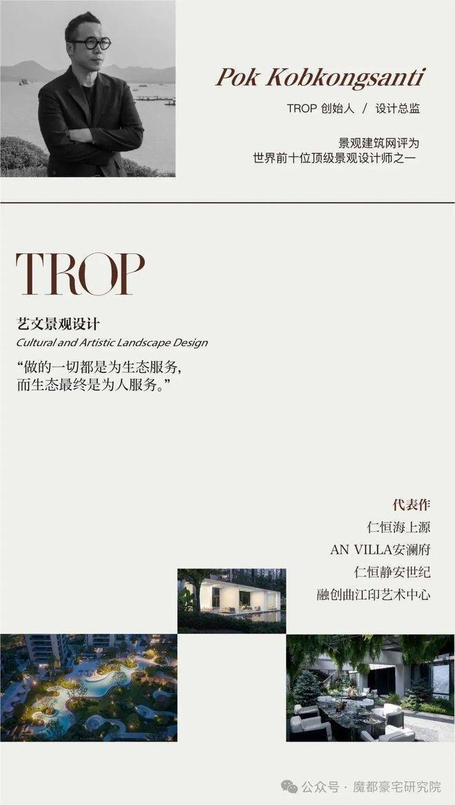 GOA大象设计担纲建筑设计;渡边智昭负责会所和架空层设计,他是2023 AD 100 中国最具影响力建筑和室内设计师,代表作翠湖天地、汤臣一品;TROP操刀艺文景观设计;室内由W.DESIGN无间设计、李益中精琢...
