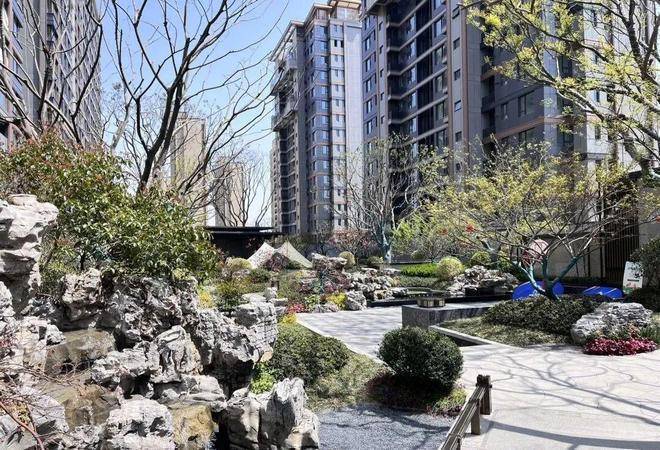 一条清韵石径,挑选造型独特的石头、三两组合成景,搭配特选的造型植物,极具艺术美感。而清泉石流景墙背后,就是未来业主的生活区。