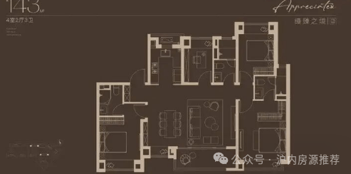 没什么好说的,冲!改善宽奢3房!标准的长面宽、短进深户型,再加上大宽厅的设计,采光面非常出众。另外,宽厅除了增加南向采光面外,还能作为一个灵动空间,不管是用作健身区域、瑜伽空间还是孩子的游玩天地,都是极佳的选择。一步到位的宽奢4房!这是一个超大横厅的飞机户型,尺度感超强,餐厅甚至能放下一个8人桌,让一家人享受天伦。