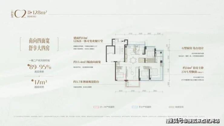约128㎡「越级洋房」四室两厅两卫,实现了约89-95%的高实得率,将同等面积段产品的空间利用率推至新高度,做到真正的大四卧格局。