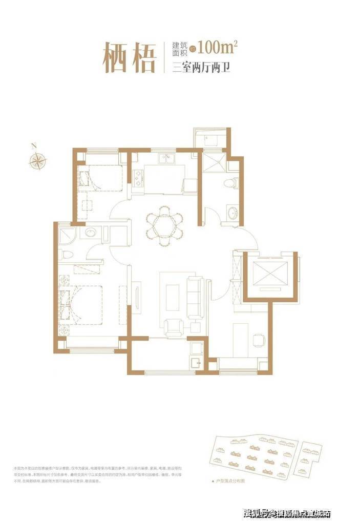 建面约100㎡户型3室2厅2卫▼