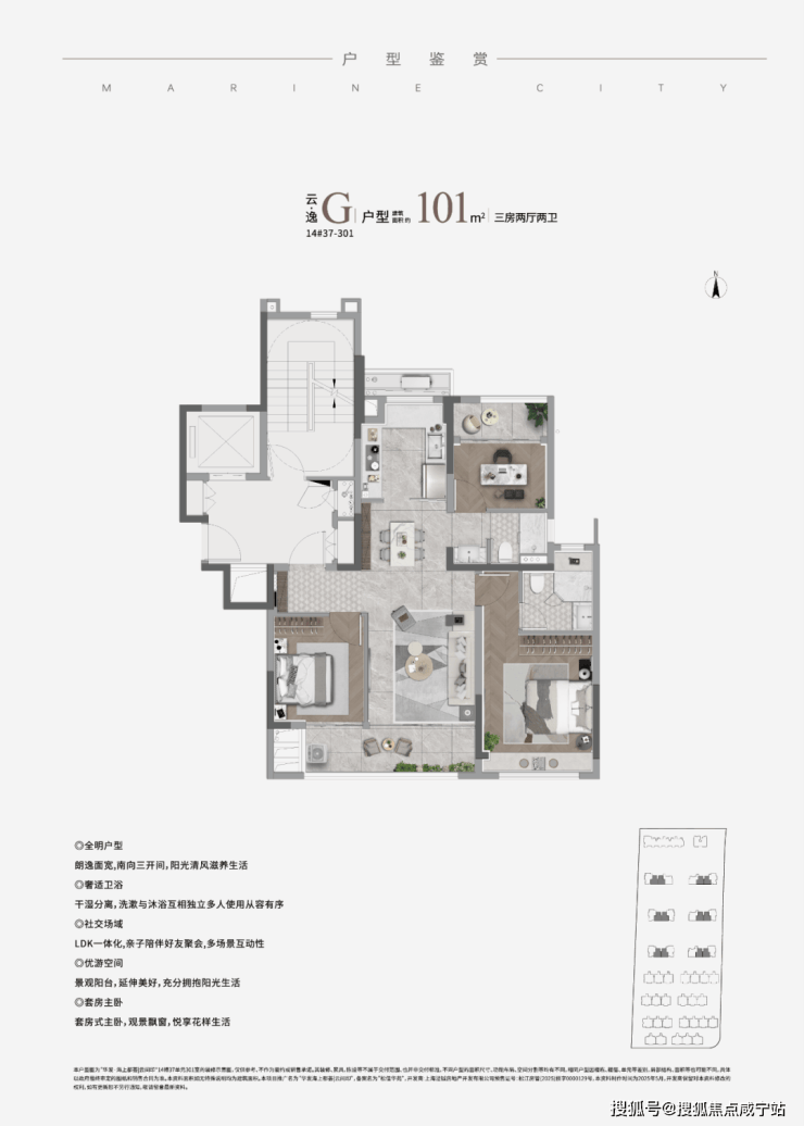 建面约101㎡户型,做到了3房一步到位,购房者也无需更多纠结,同时还可获得更统一的圈层;