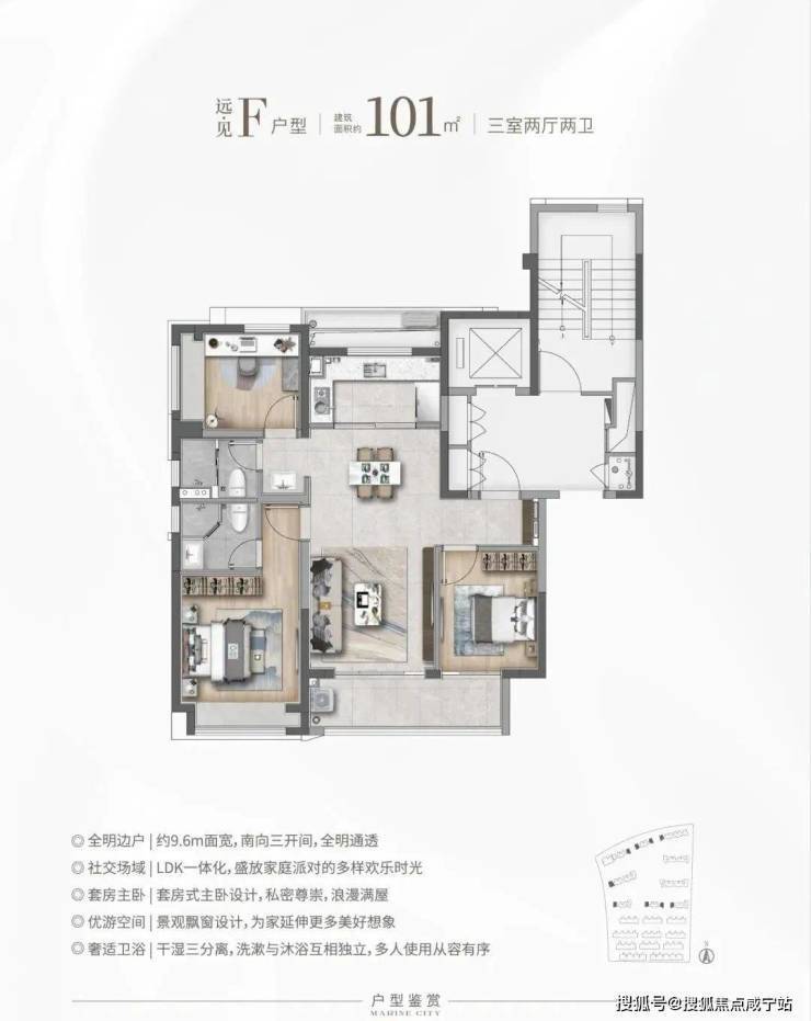 F户型:远·见 建筑面积约101㎡,三房两厅两卫