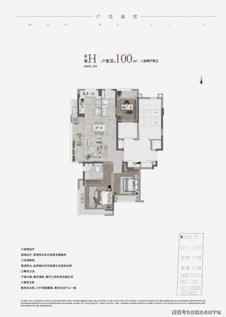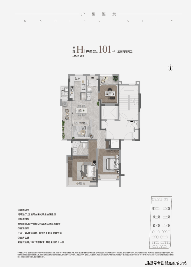 H户型:瞰·见 建筑面积约101㎡,三房两厅两卫