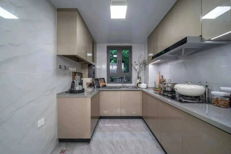 厨房 :方太烟灶消三件套、摩恩水槽龙头、定制橱柜,U 型布局,操作便捷。