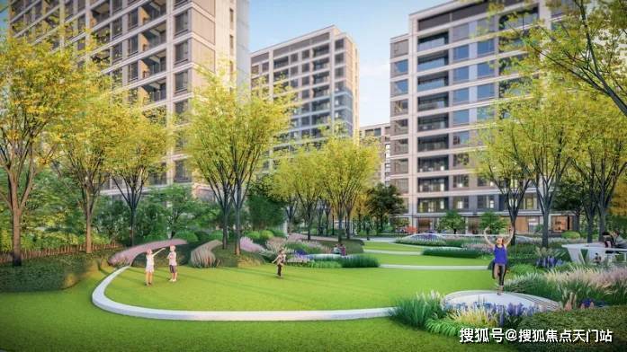 以公园+花园的双园社区、品质归家入口、特色阳光草坪、双会客系统、主题儿童乐园、健身系统这六大功能价值为主,并且融合由三条不同主题的林荫步道和三个圆形景观节点组成的“绿林项链”全区漫步系统,共同构成全区“6+1”森O₂家园系统。