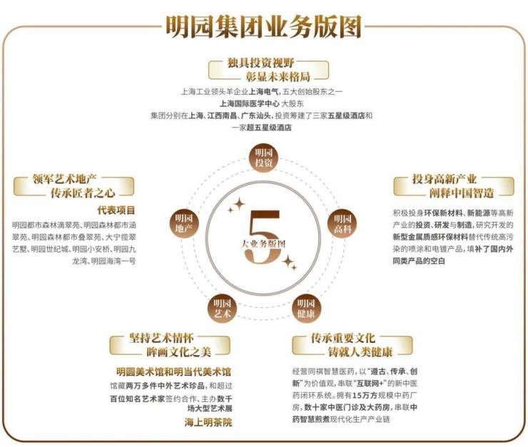 明园地产、明园投资、明园艺术、明园健康、明园高科五大业务版图