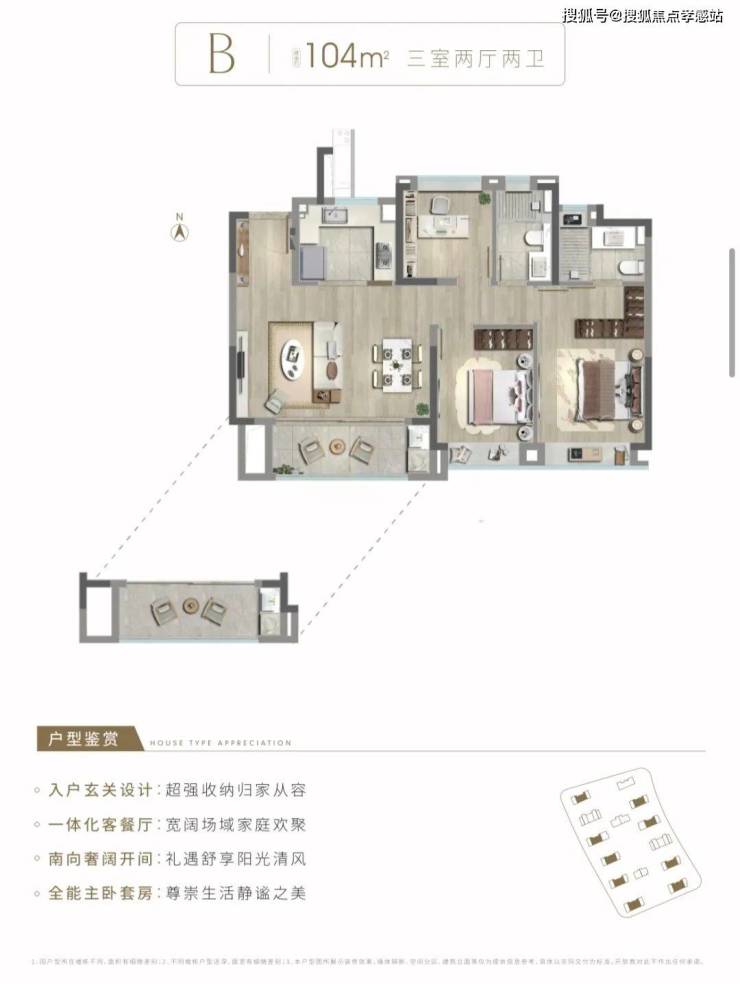 建面约104㎡3房2厅2卫,中间套D户型,做到了三开间朝南+主卧套房设计+朝南卧室带飘窗+动静分离,采光和通风俱佳。⫸⫸⫸盛青云锦售楼处电话: 400-8787-740【已认证】⫷⫷⫷