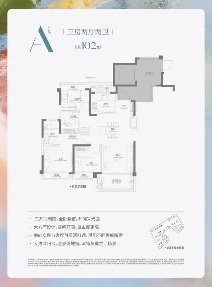 三开间朝南。拥有充分的采光。主卧及北卧室还带有L型飘窗,大进深阳台全景落地窗,优化采光,提升观景体验。