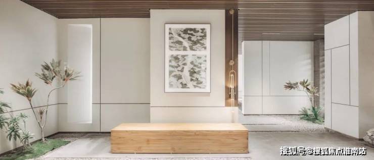 地上入户大堂采用中式经典构图方法——框景,打造未进门,先见景的效果。中国人一直讲究,生活中处处有景。框景的工艺就是能做到从任何一个框望过去都是景色,角度不同景色也不同,一步一景的效果。