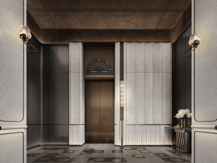 归家大堂层高约6米,融合传统门庭规制与现代酒店仪式,营造极具尊贵感的归家体验。