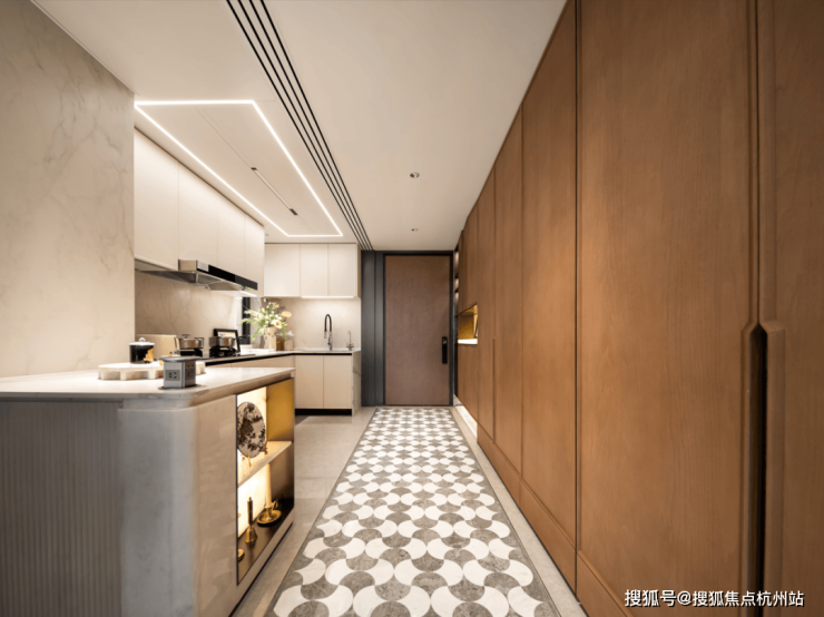 开门采用完美系列水波纹玻璃加上金属造型边框的玻璃移门,时尚又大气。顶部配置线性凉霸、LED 嵌入式回形灯带和筒灯,烹饪时光也变得无比美妙。