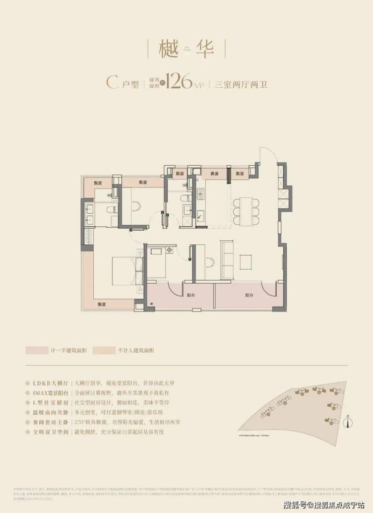 建面约128㎡户型则是双阳台+6飘窗的配置。要知道项目户型飘窗有可能采用非承重结构,交付后可改造为储物空间或拓展室内面积。