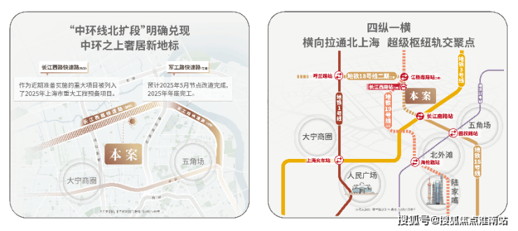 地铁18号线二期(在建)将原本不完全相连相交的四线地铁1号线、3号线、18号线、19号线(在建)横向拉通,北上海轨交因此互联,淞南将成为区域轨交的聚点;同时,本案近邻长江西路地铁站(直线距离约150米),1站江杨南路、5站复旦大学、7站五角场,便捷畅达。