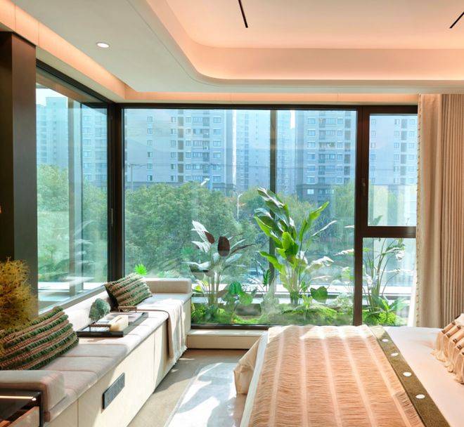 主卧套房式设计+带独立衣帽间+270度转角飘窗,尊崇感与私密性拉满。
