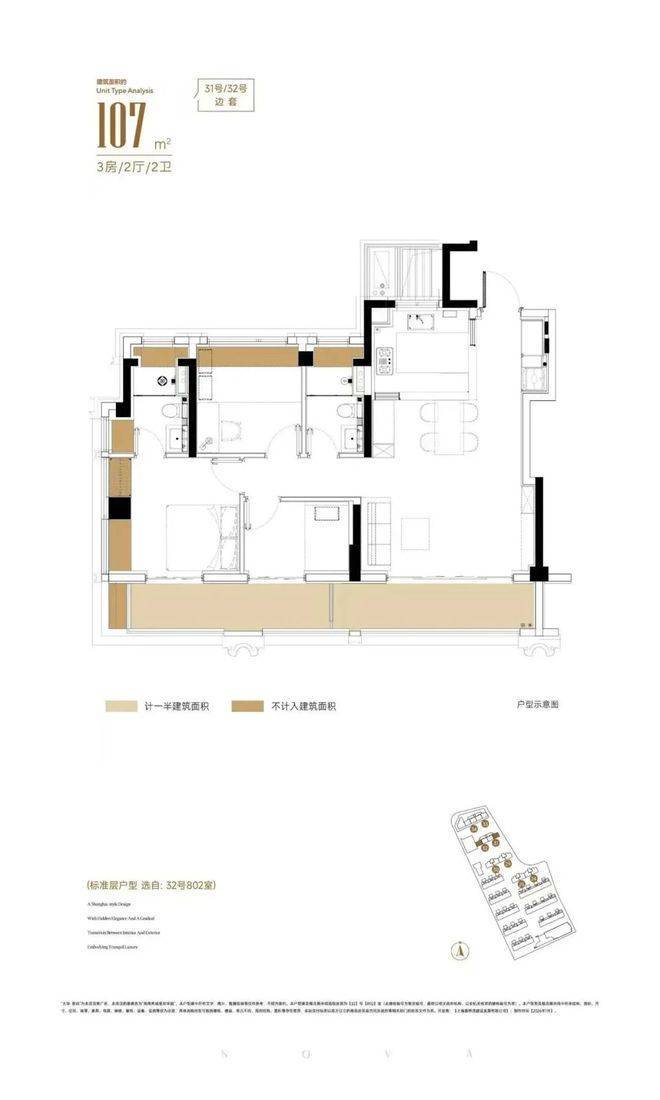 建面约107㎡的三房两厅两卫