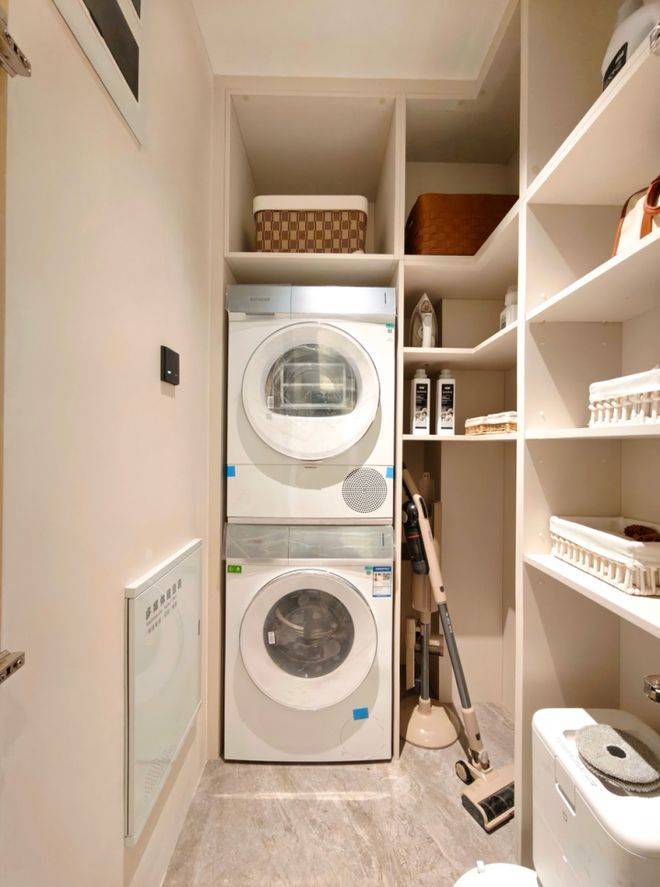 类一梯一户的设计,门口带有一个巨大的电梯厅空间,业主可以利用成为收纳空间。入户后,是一个独立玄关+800库设计,让业主常用物品(洗衣机、清洁工具等)有了绝佳的放置位置。